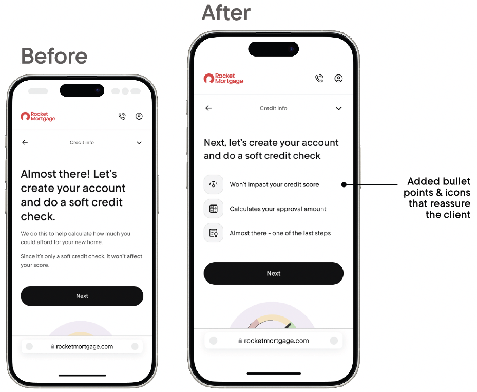Adding an interstitial screen that reinforces the client’s goal and explains why we ask for contact information helps build trust and reduce user hesitation. By clearly framing the value of sharing their info, users feel more informed and in control — leading to a +17% uplift in Soft Credit Pulls.